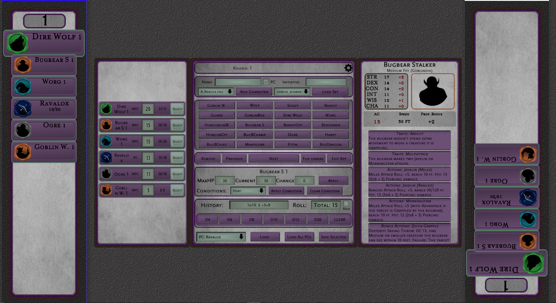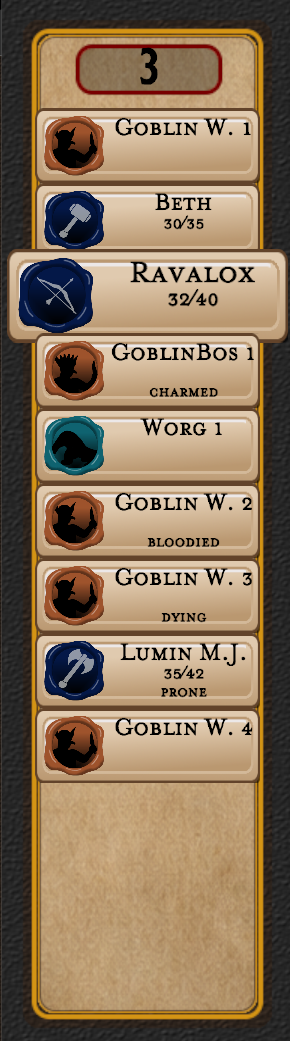 The two tracker windows will show all of the monsters and PC’s in their initiative order. Whichever characters turn it is will be highlighted by their character tile being larger. When you press the next button the next character in line will be highlighted.